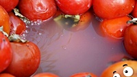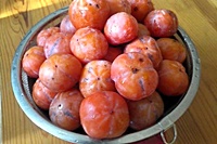 감을 깨끗하게 물로 씻어 줍니다. 감 표면에는 발효에 필요한 아세트산이 붙어 있으므로 너무 박박 씻지 않도록 합니다. 씻은 감의 꼭지를 제거합니다.